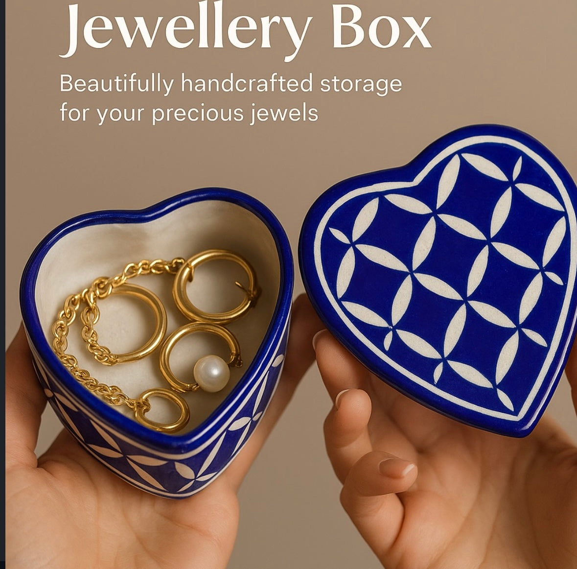 Store your precious jewels in timeless elegance with our Celestial Bloom heart-shaped jewellery box. Handcrafted using traditional blue pottery techniques, this stunning piece features a bold geometric pattern in deep cobalt blue and white. Perfect for storing rings, earrings, or cherished keepsakes, it blends beauty with purpose — a charming addition to your dresser or vanity.